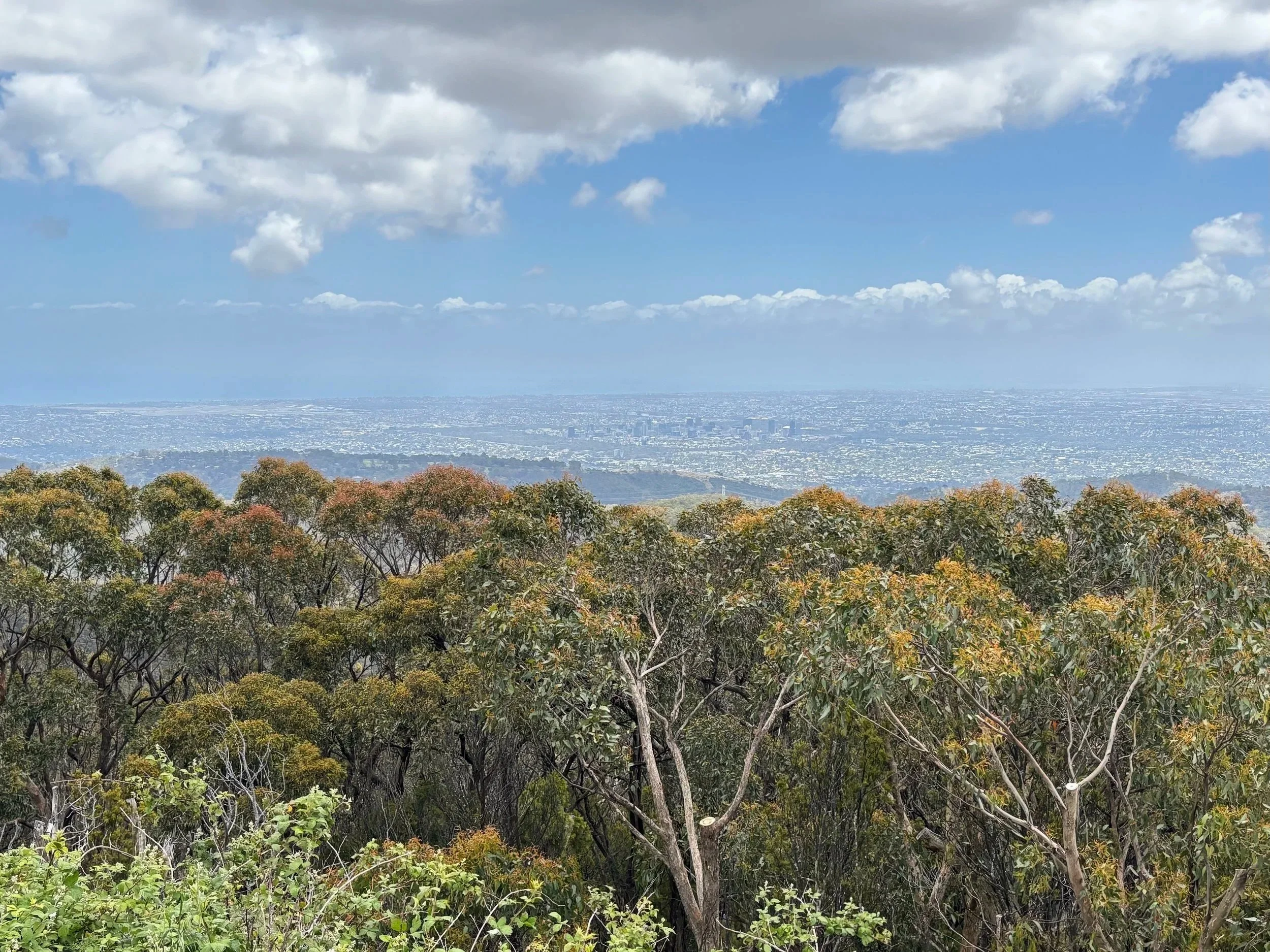Ajoin bussilla Crafersiin, josta yksi reiteistä Mt Loftyn huipuille lähti. Tämä osuus oli rauhallinen ja muita kulkijoita oli hyvin vähän. Tähystin koaloja ja ihailin aina välillä kauas Adelaiden yli merelle asti avautuvaa maisemaa. Noin 5 km päästä saavuin Mt Loftyn huipulle, jossa ihmisiä sitten puolestaan riittikin. Huipulle pääsee eri kävelyreittien lisäksi myös autolla ja siellä on mukava kahvila, johon itsekin istahdin hetkeksi herkuttelemaan.