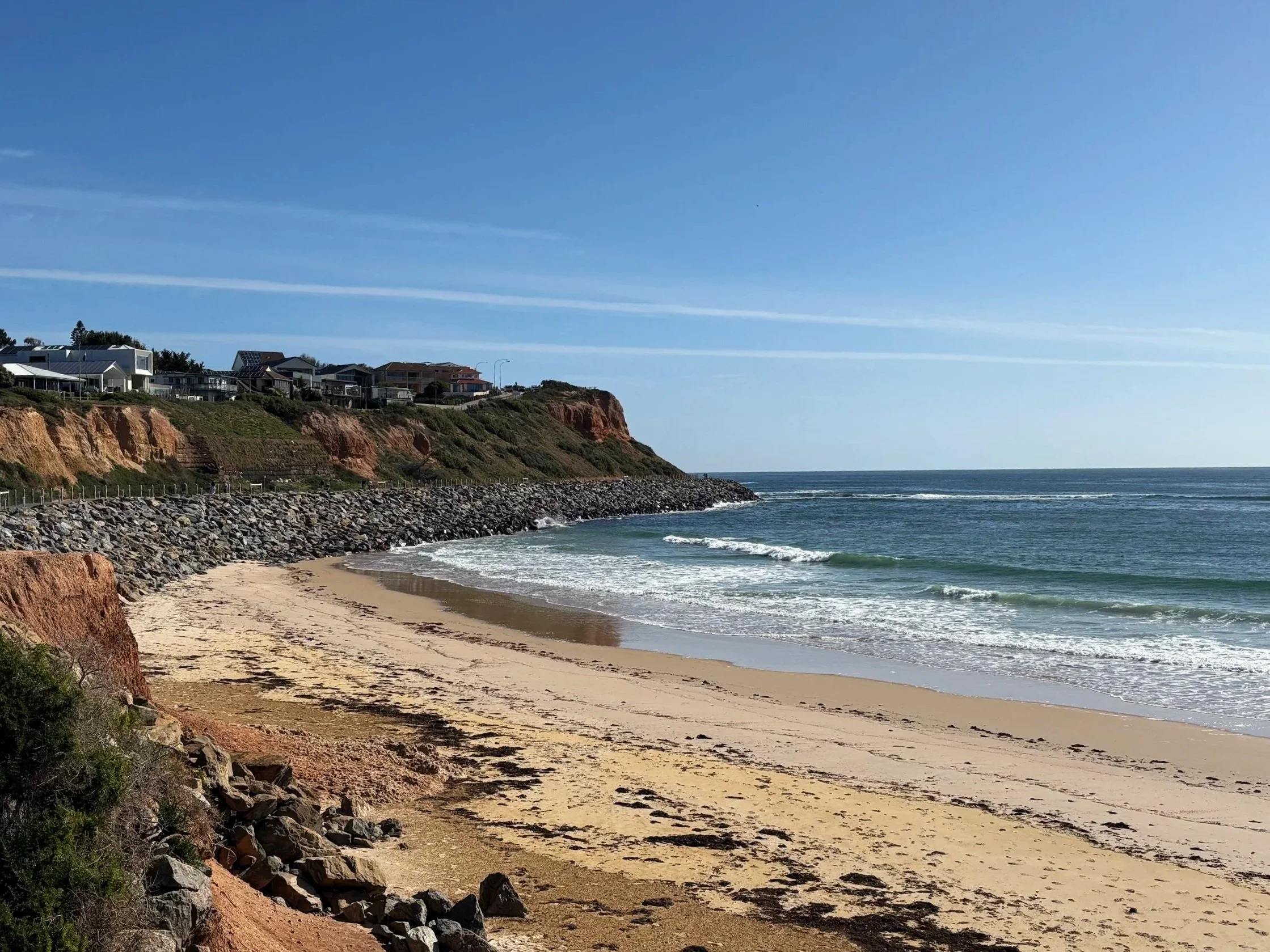 Port Noarlunga on rantakaupunki Adelaiden eteläpuolella. Siellä on upea ranta ja sinne pääsee julkisilla kulkuvälineillä noin tunnissa. Itse valitsin bussit, mutta myös paikallisjuna vie osan matkasta. Rannikkoa pitkin kulkee upea rantareitti, jota voi kulkea haluamansa matkan. Itse kuljin vain lyhyen pätkän – Christie’s Beachiltä Port Noarlunga Beachille. Tulin paikalle illemmalla ja ihailin laskevan auringon kultaa meressä ja punertavilla rantakallioilla. Perillä Port Noarlungassa kävin iltauinnilla juuri ennen kuin rantavalvojat pakkasivat tavaransa. Astelin pitkän laiturin päähän kalastajien ohi ja katselin merelle.