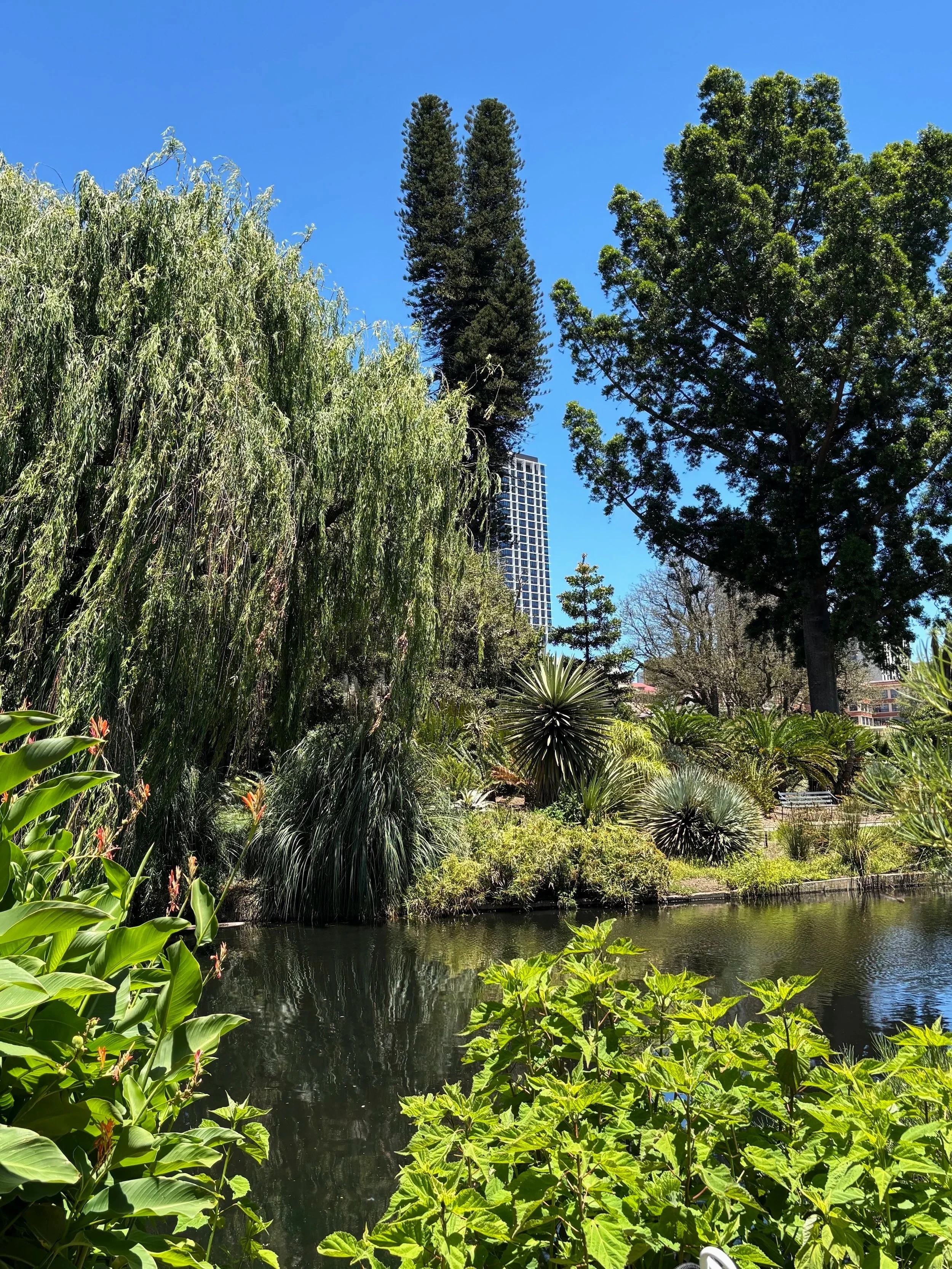 Adelaide Botanic Gaden on ilmainen puutarha ydinkeskustan laidalla. Vehreyden keskellä on rauhallista kävellä ja sieltä täältä löytyy pieniä kasvihuoneita sekä penkkejä ja nurmikkoalueita eväiden syöntiin. Kuten kasvitieteelliset yleensäkin, myös tämä on jaettu erilaisiin osioihin paikallisista kasveista eksoottisempien kokoelmien kautta aina hyötykasvitarhoihin. Puutarhasta löytyy myös pääsymaksullinen näyttelytila, jossa vierailuni aikaan oli esillä vuoden luontokuvia. Jätin sen kuitenkin väliin. Oma lähestymistapani oli kulkea sinne missä kiinnostavimmalta risteyksissä näytti ja mukana oli Central Marketista eväitä, jotka nautin varjoisella penkillä.