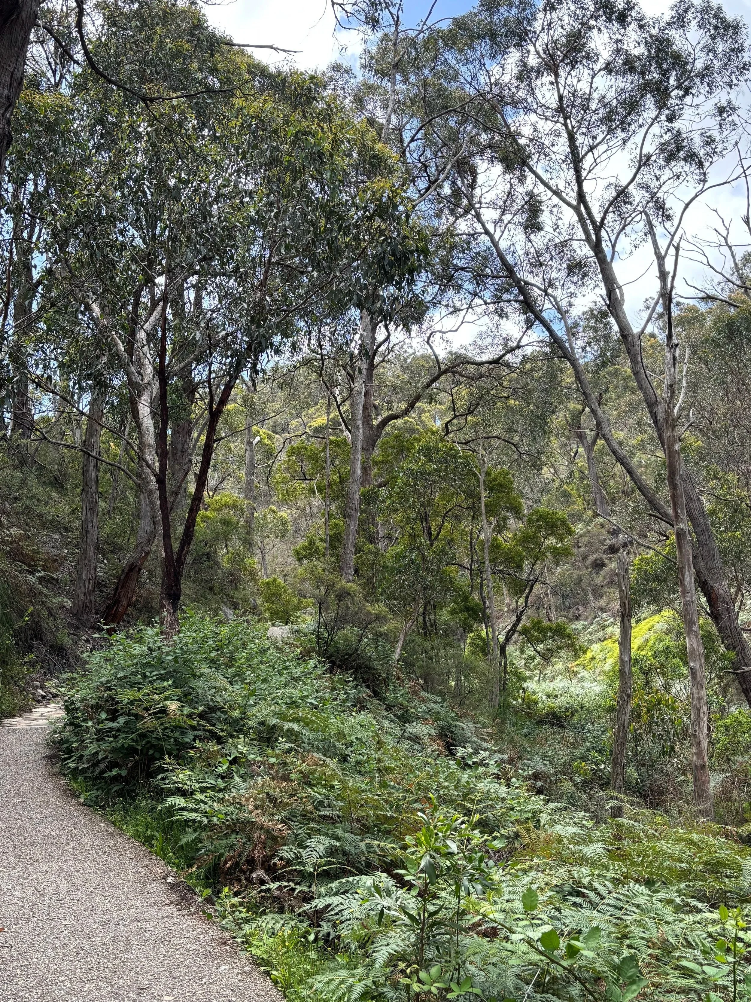 Pois lähtiessäni päätinkin spontaanisti etten kävelekään samaan paikkaan takaisin, vaan lähdin kohti Waterfall Gullya. Tämä reitti (4,5 km) on huomattavasti suositumpi ja paikallisille yleinen kuntoreitti. Useampikin urheilija ja kuntoilija juoksi joko vastaan tai ohi – osa iloisesti hymyillen, osa raskaasti puuskuttaen. Reitti on jyrkkä ja kauttaaltaan päällystetty. Minä sain kävellä alamäkeen. Maisemat ja kasvusto on tällä reitillä mielestäni monipuolisempaa kuin Crafersista tultaessa, vaikka Crafersin polku onkin enemmän luonnontilassa. Näin täällä myös kengurun. Yhdessä rauhallisemmassa kohdassa se loikkasi polulle eteeni korkeasta pensaikosta, katsoi minua sekunnin ja loikkasi eteenpäin, kadoten taas metsän suojiin. Hyvä, että ehdin edes tajuta sen olleen siinä.